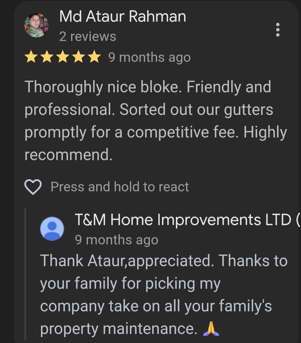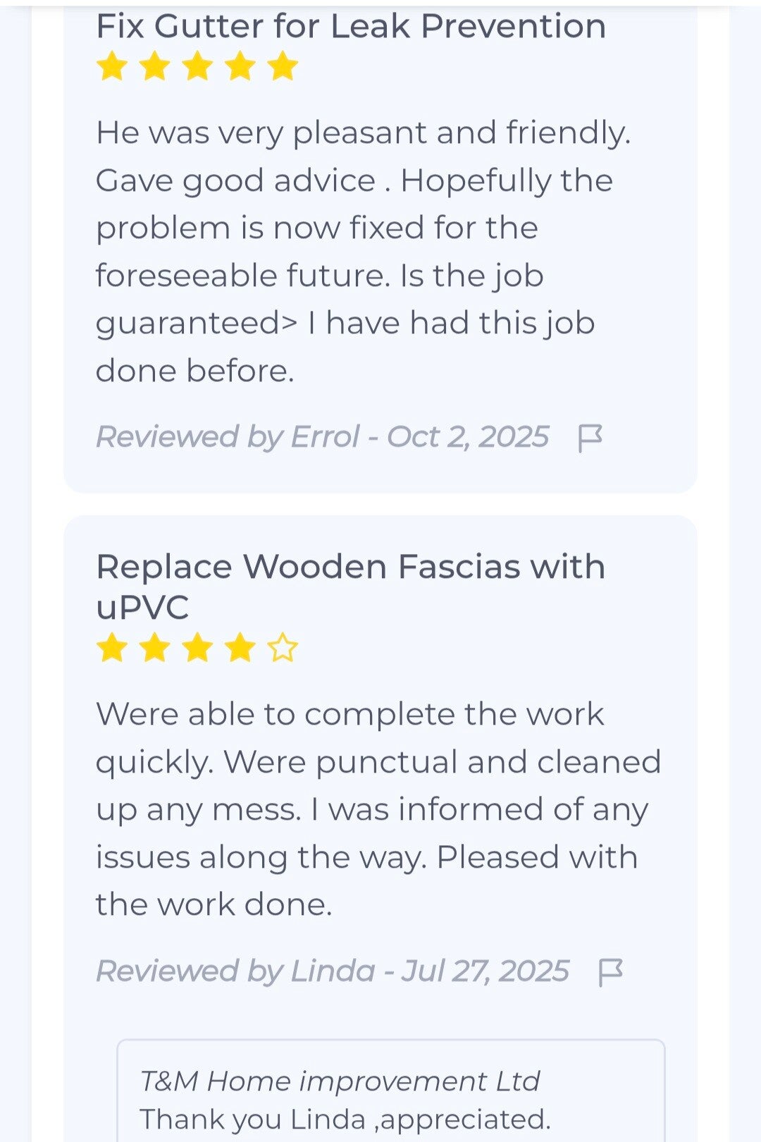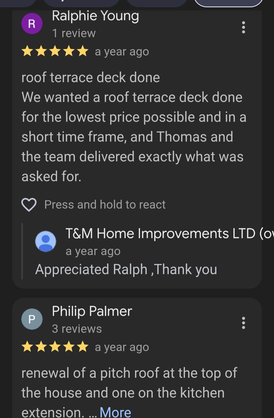 We have used T&M Home Improvement previously on a family home ,but when my office roof started to leak, i contacted Thomas from T&M Home Improvement, who came over and literally fixed the issue there and then.